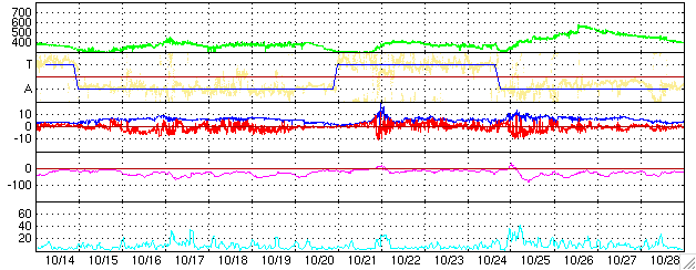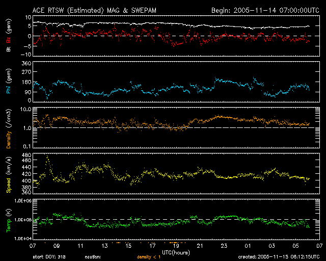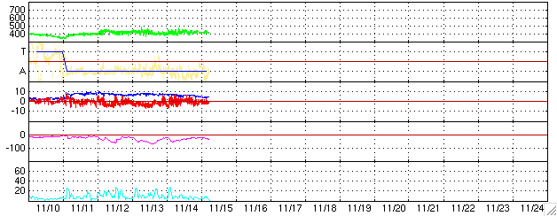 GOES衛星の太陽X線データ (c) NOAA/SEC ![]() SOHO衛星のMDIカメラによる太陽黒点 (c) SOHO (ESA & NASA) ![]() ACEが観測した太陽風の磁場(1番上の枠、白線は全体の強度、赤線は南北成分) および、太陽風の密度(3番目の橙線)、速度(4番目の黄線) (c) NOAA/SEC ![]() シベリアで観測された3日間の磁場データ 右側の3分の1が、昨日のデータになります。グラフが上がったり下がったりすると、オーロラ活動が活発化しています。 (c) NICT ![]() 27日の太陽周期に合わせたデータプロット (太陽風版) 太陽が同じ面を地球に向けていた27日前の変化から、今後を予想することができます。 (c) NICT