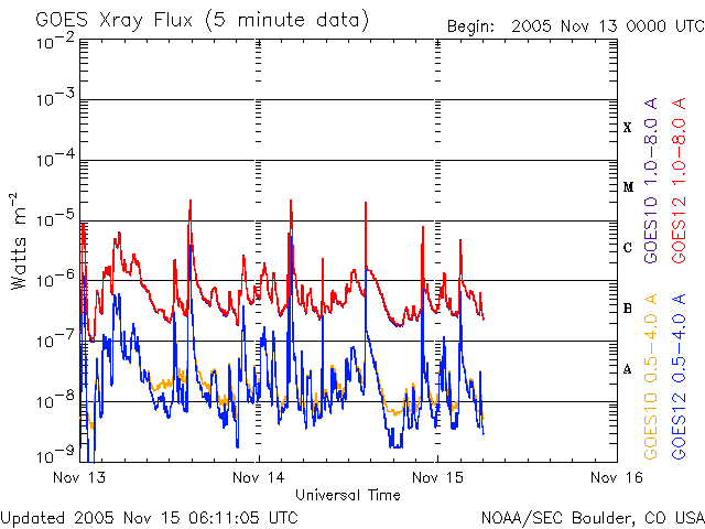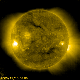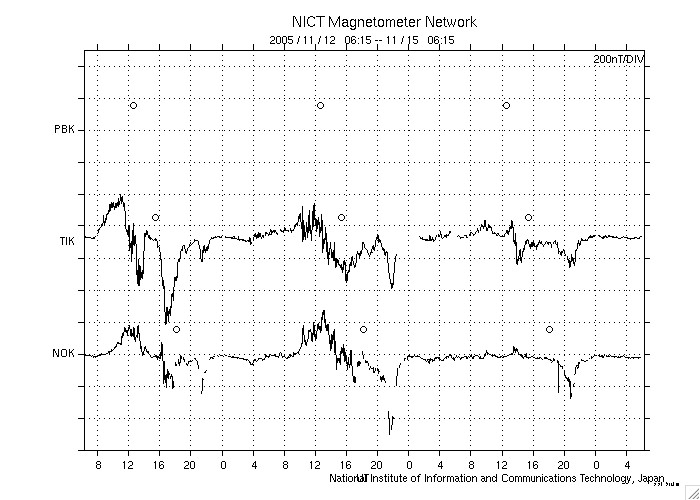 2005/11/15 15:12 更新 822黒点群が、中規模フレアなど活発な活動を起こしています。 担当 篠原 先ほど、ロシア・カムチャッカより帰国しました。 関西空港より更新しています。 822黒点群は、太陽のこちら側に回って来るとともに、活発な活動を見せ続けています。 13日のニュースで中規模フレアの報告をしましたが、 その後2日間の間に、昨夜14日23時(世界時13日14時)のM3.9を最大として、 Mクラスの中規模フレアを4回、C5以上の大きめの小規模フレアを3回発生させました。 822黒点群の規模は大きく、発達を続けている様です。 今後、Xクラスの大規模フレアを起こす可能性もあるとのことです。 黒点群は太陽の自転とともに、太陽の中心へと次第に移動してきます。 今後は、CME(太陽ガス放出現象)を伴う活動が発生した場合に、 太陽風の乱れとして地球磁気圏へ影響を及ぼす可能性が大きくなります。 太陽風は、速度400km/秒前後と通常の速度で安定しています。 磁場強度は8nTから5nTにやや弱まっています。 磁気圏への影響を決める南向きの磁場成分は、 13日は-3nT程度の南向きがずっと続いていた様です。 このため、シベリアの磁場データも長時間活動的な変動を観測しています。 変化の規模は800nTに届かない程度で、それほど大きなものではありません。 14日に入って南向き磁場の見られる割合が減りました。 シベリアの磁場データもそれとともに変化が小さくなっています。 ここまでの変化は27日周期の図で、前周期に見られた変化と良く似ています。 磁場強度が下がり始めていますが、続いて速度も弱まり、 やがてセクター境界を迎えるという展開が、明日明後日にかけて予想されます。 SOHO衛星のEIT284カメラの映像 (c) SOHO (ESA & NASA)