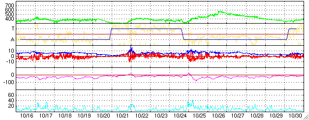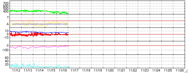 SOHO衛星のMDIカメラによる太陽黒点 (c) SOHO (ESA & NASA) ![]() GOES衛星の太陽X線データ (c) NOAA/SEC ![]() ACEが観測した太陽風の磁場(1番上の枠、白線は全体の強度、赤線は南北成分) および、太陽風の密度(3番目の橙線)、速度(4番目の黄線) (c) NOAA/SEC ![]() シベリアで観測された3日間の磁場データ 右側の3分の1が、昨日のデータになります。グラフが上がったり下がったりすると、オーロラ活動が活発化しています。 (c) NICT ![]() 27日の太陽周期に合わせたデータプロット (太陽風版) 太陽が同じ面を地球に向けていた27日前の変化から、今後を予想することができます。 (c) NICT