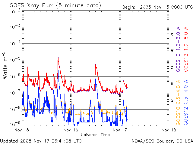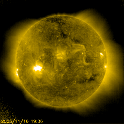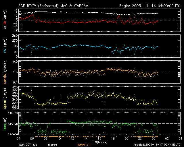 2005/11/17 12:45 更新 822黒点群はC5.9の小規模フレアを起こしています。フィラメント消失により小規模のCMEが観測されています。 担当 篠原 822黒点群は依然活発です。 昨日のニュース以降、16日20時半(世界時16日11時半)にC5.9の小規模フレアを起こしています。 ただ、一休みなのか、減衰に向かっているのか、活動のペースはやや落ちています。 黒点群の規模は保たれていますので、引き続き注意する必要はあるでしょう。 一方、17日0時(世界時16日15時)に太陽の中心からやや西寄りのところで、 フィラメント消失が発生しました。 この影響で、弱いCME(太陽ガスの放出現象)が発生しています (SOHO LASCO C3の写真で西(右)を中心に淡くガスが広がっています)。 規模が小さいので、地球へ影響が及ぶかどうか分かりませんが、 届くとすると3日後の20日0時(世界時19日15時)の辺りになるのではないでしょうか。 大きな速度の乱れは発生しないと思います。 太陽風は一段と速度が下がって、350km/秒付近を上下しています。 太陽風磁場は強度5nT。 -1〜-2nTの弱い南向きが比較的長時間見られています。 このため、普段よりも高緯度域でオーロラ活動が見られている様です。 シベリア磁場データではほとんど変化が見えていませんが、 他の観測点で小規模のオーロラ活動が観測されています。 このあたりの太陽風の変化は、27日周期で前周期に見られた変化と似ています。 これから太陽風磁場のセクター境界がやってくることになると思います。 この現象自体の影響で磁気圏が活動的になるということはありません。 SOHO衛星のEIT284カメラの映像 (c) SOHO (ESA & NASA)