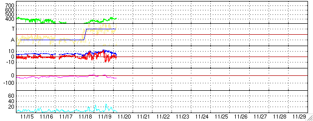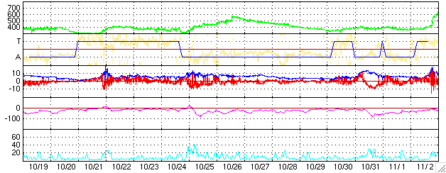ACEが観測した太陽風の磁場(1番上の枠、白線は全体の強度、赤線は南北成分) および、太陽風の密度(3番目の橙線)、速度(4番目の黄線) (c) NOAA/SEC ![]() シベリアで観測された3日間の磁場データ 右側の3分の1が、昨日のデータになります。グラフが上がったり下がったりすると、オーロラ活動が活発化しています。 (c) NICT ![]() 27日の太陽周期に合わせたデータプロット (太陽風版) 太陽が同じ面を地球に向けていた27日前の変化から、今後を予想することができます。 (c) NICT