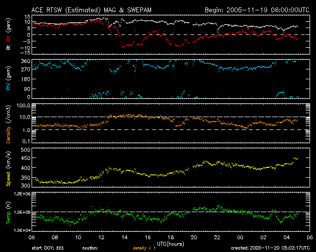 2005/11/20 14:03 更新 19日21時(世界時19日12時)頃にCMEによる太陽風の乱れが届いた様です。 担当 篠原 17日0時(世界時16日15時)頃に太陽で発生したフィラメント消失にともなって発生した CME(太陽ガスの放出現象)による太陽風の乱れが、 19日21時(世界時19日12時)頃に地球にやってきた様です。 比較的小さな乱れですが、ACE衛星の太陽風データを見ると、 速度(黄色線)と密度(橙色線)がそれぞれ上昇しています。 ただし、上昇後の速度(400km/秒)から考えると、到着がやや早すぎるようでもあり、 CMEとは関係ない乱れの可能性もあります。 乱れの到来とともに太陽風磁場が急に大きく南を向き(-10nT)、 10時間ほどかけて南から北へと切り替わっています。 CMEによって、磁場の大きなかたまりが飛んできたことによる磁場変化でしょう。 太陽風磁場が大きく南を向くと、磁気圏の活動が強まりますが、 今回は太陽風の速度が400km/秒を切る程度だったため、それほどの乱れにはなっていません。 シベリアの磁場データを見ると、最大で500nT程度の変化幅で、 小規模のオーロラ活動が見られた程度の様です。 現在の太陽風速度は400km/秒で、通常の速度レベルです。 CMEによる乱れは既に通過したようで、 磁場強度は下がり、南北磁場の振幅も小さくなっています。 磁気圏は、ひとまず穏やかな状態に戻りそうです。 27日周期の図を見ると、明日から明後日にかけて、 セクター境界、続いて速度の上昇、という変化が見られるかもしれません。 太陽では822黒点群がゆっくりと勢力を弱めている様です。 昨日のニュース以降はC1.5の小さな小規模フレアを起こした程度です。 ただ、規模はまだ大きいので、引き続き小規模、中規模のフレアは起こす可能性があります。 黒点写真にはまだ番号がついていませんが、822黒点群の右下に新しく823黒点群ができています。 SOHO衛星のEIT284カメラの映像 (c) SOHO (ESA & NASA)