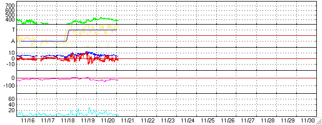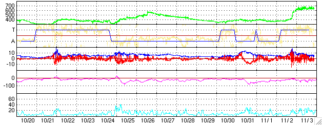 ACEが観測した太陽風の磁場(1番上の枠、白線は全体の強度、赤線は南北成分) および、太陽風の密度(3番目の橙線)、速度(4番目の黄線) (c) NOAA/SEC ![]() シベリアで観測された3日間の磁場データ 右側の3分の1が、昨日のデータになります。グラフが上がったり下がったりすると、オーロラ活動が活発化しています。 (c) NICT ![]() 27日の太陽周期に合わせたデータプロット (太陽風版) 太陽が同じ面を地球に向けていた27日前の変化から、今後を予想することができます。 (c) NICT