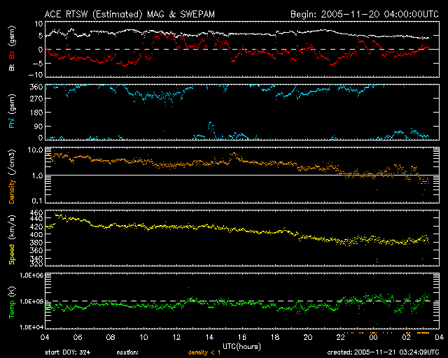 2005/11/21 12:26 更新 太陽風は穏やかですが、南向き磁場の影響で小規模のオーロラ活動が見えています。822黒点群は縮小傾向にあります。 担当 篠原 太陽風は400km/秒前後の穏やかな速度が続いています。 昨日より、緩やかに下がる傾向が見られています。 太陽風磁場も5nTと普通の状態ですが、-4nT程度の南向きが比較的長時間現れています。 この影響でオーロラ活動が刺激を受け、小規模な活動が続いている様です。 シベリアの磁場データを見ると、最大と最小の幅で約600nTの変化が観測されています。 27日周期の図を参考にすると、これからセクターの境界が現れ、 コロナホールによる太陽風速度の増加が現れることになりそうです。 ただし、SOHO EIT284で見えるコロナホールの分布が、前周期とかなり変わっていますので、 太陽風の様子も変わるのではないかと思います。 今周期(11月19日)と、前周期(10月23日)のEIT284の写真を並べて掲載します。 全体的にコロナホールが淡くなって、見えなくなっています。 今日、明日にかけての太陽風の変化に注目してください。 822黒点群はかなり弱まってきました。 小さいCクラスの小規模フレアを起こしてはいますが、黒点群としての規模の縮小傾向が見えてきました。 一方、東の端から新しく824黒点群が上がってきました。 規模は小さい様です。 SOHO衛星のEIT284カメラの映像 (c) SOHO (ESA & NASA)