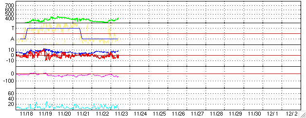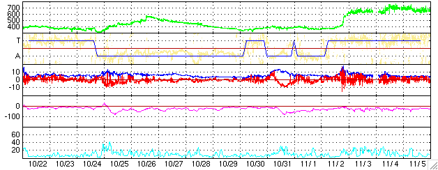 ACEが観測した太陽風の磁場(1番上の枠、白線は全体の強度、赤線は南北成分) および、太陽風の密度(3番目の橙線)、速度(4番目の黄線) (c) NOAA/SEC ![]() シベリアで観測された3日間の磁場データ 右側の3分の1が、昨日のデータになります。グラフが上がったり下がったりすると、オーロラ活動が活発化しています。 (c) NICT ![]() 27日の太陽周期に合わせたデータプロット (太陽風版) 太陽が同じ面を地球に向けていた27日前の変化から、今後を予想することができます。 (c) NICT