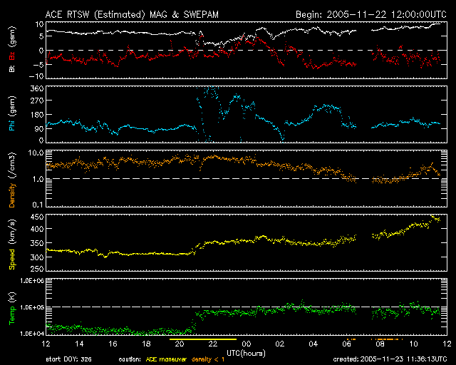 2005/11/23 20:37 更新 太陽風の速度が通常レベル(430km/秒)に戻っています。オーロラ活動が活発になりそうです。 担当 篠原 更新が遅くなり申し訳ありません。 掲載しているACEデータでは前半部が流れてしまいましたが、 太陽風磁場が-3〜-5nTの南向きのまま、半日ほど続くという状態が発生していました。 ただし、太陽風の速度は320km/秒と遅いままです。 この南向き磁場の影響で、オーロラが活発になっていた様です。 シベリアの磁場データを見ると、変化幅が最大で800nTに達するオーロラ活動が観測されています。 速度が遅かったので大きな活動にはつながっていませんが、ある程度の規模の活動は続いていた様です。 太陽風磁場は南向きが一旦弱まりますが、 23日6時(世界時22日21時)からは、速度の上昇が始まっています。 現在、速度は430km/秒と通常レベルを越えつつあります。 また、それとともに磁場強度が10nT程度に強まっています。 前周期に見えていた、高速風領域の名残りでしょうか。 磁場強度が上がっているので、速度はもう一段上昇する可能性があります。 強まった太陽風磁場はここでも南寄りを卓越して運んでいます。 このため、磁気圏の活動が刺激を受けそうです。 今回は、速度がやや上がっていますので、オーロラの活動もより活発になる可能性があります。 シベリアの磁場データで変化が観測されるのは、これからです。 太陽では、822黒点群が次第に西の端に近づいてきました。 もはや目立ったフレア活動はなく、穏やかな太陽です。 SOHO衛星のEIT284カメラの映像 (c) SOHO (ESA & NASA)
