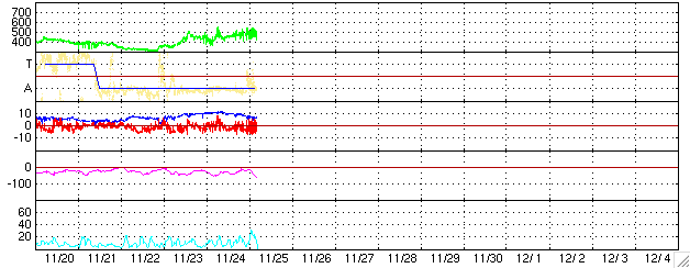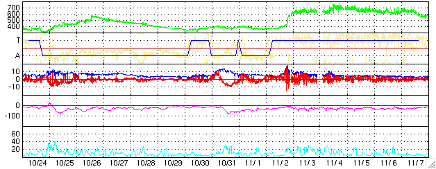 ACEが観測した太陽風の磁場(1番上の枠、白線は全体の強度、赤線は南北成分) および、太陽風の密度(3番目の橙線)、速度(4番目の黄線) (c) NOAA/SEC ![]() シベリアで観測された3日間の磁場データ 右側の3分の1が、昨日のデータになります。グラフが上がったり下がったりすると、オーロラ活動が活発化しています。 (c) NICT ![]() 27日の太陽周期に合わせたデータプロット (太陽風版) 太陽が同じ面を地球に向けていた27日前の変化から、今後を予想することができます。 (c) NICT