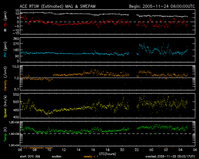 2005/11/25 14:04 更新 コロナホールのため太陽風が500km/秒に上がっています。オーロラもやや活発に発生しています。 担当 篠原 昨日、速度が400km/秒近くに下がっていた太陽風ですが、 その後再び上昇を始め、480〜500km/秒付近で安定しています。 昨日の太陽風磁場の強まりは、この速度上昇と関係していた様です。 今日掲載しているSOHO EIT284の写真は、昨日の写真と同じものですが、 この写真の南側に見えている小規模のコロナホールの影響が地球に及んでいると思われます。 磁気圏への影響を決める、太陽風磁場の南北成分は、 今日のACEの図の前半では-2nTくらいの弱い南向きが続いています。 この影響もあってか、シベリアでは600nTくらいのやや活発なオーロラ活動が見られています。 そして、ACEの図の後半では、-5nTくらいの大きさで振動するような変化に変わっています。 シベリアはもう観測に適した時間を外れてしまっていますが、 極域では引き続いてオーロラ活動が発生していると思われます。 むしろ、今の方が活動は強まっているかもしれません。 太陽風の磁場は既に弱まり始め、現在は5nTに下がっています。 したがって、高速風がこれ以上あがることはなさそうです。 コロナホールの規模も小さい事から、比較的早く速度の低下が始まるのではないでしょうか。 太陽のフレア活動は、とても穏やかです。 822黒点群は今日が最後の姿でしょう。 残るのは、小さな824黒点群だけです。 SOHO衛星のEIT284カメラの映像 (c) SOHO (ESA & NASA)