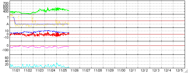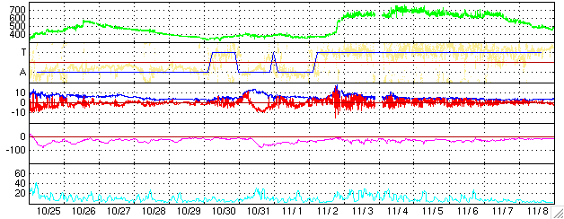 ACEが観測した太陽風の磁場(1番上の枠、白線は全体の強度、赤線は南北成分) および、太陽風の密度(3番目の橙線)、速度(4番目の黄線) (c) NOAA/SEC ![]() シベリアで観測された3日間の磁場データ 右側の3分の1が、昨日のデータになります。グラフが上がったり下がったりすると、オーロラ活動が活発化しています。 (c) NICT ![]() 27日の太陽周期に合わせたデータプロット (太陽風版) 太陽が同じ面を地球に向けていた27日前の変化から、今後を予想することができます。 (c) NICT