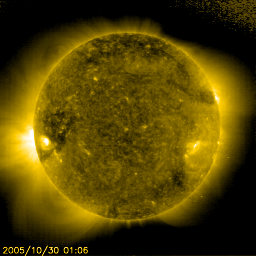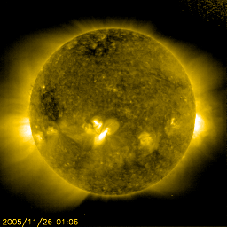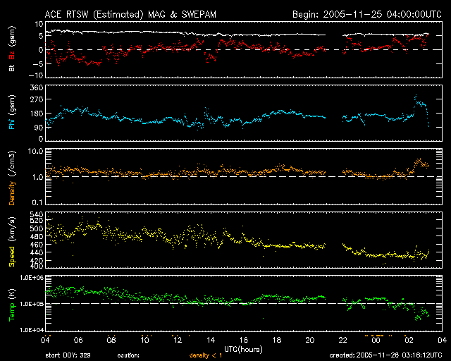 2005/11/26 12:18 更新 昨日は活発なオーロラ活動が見られたようです。太陽風の速度は通常レベルに下がっています。 担当 篠原 500km/秒に上昇していた太陽風は、昨夜からゆっくりと速度を下げ始め、 現在は430km/秒とほぼ通常の速度に戻っています。 太陽風磁場は5nT前後で安定していますが、 今日のACEの図の前半部分では、-5nTの南向きが続いています。 この影響で、この時間帯は磁気圏活動が活発になっていた様です。 シベリアが観測好適域に入る前に南向き傾向が終わってしまったため、 シベリア磁場データでは小さな変化しか観測されません。 現在は北寄りに推移しており、速度の低下もあり、磁気圏の活動は穏やかになっています。 さて、SOHO EIT284の太陽写真の東端(左端)からコロナホールが姿を現しました。 このコロナホールは27日前の前周期もほぼ同じところに見えていました。 10月30日の写真と比較してください。 従って、今後の太陽風の変化は、前周期のものと似た変化になると予想されます。 コロナホールの位置を見ると、これから3日ほどかけて太陽の中心に進み、 そこで飛び出した高速太陽風が更に3日ほどかけて地球に来ると予想されます。 ところが、27日周期の図を見ると、あと4日ほどで高速風の立ち上がりがやってきています。 この変化は前回も不思議に感じていたことで、今周期がどのような変化になるか注目されます。 前周期は、最高700km/秒の高速風が6日程度続きました。 高速風の前半部でオーロラ活動も活発に起こしています。 放射線帯の高エネルギー電子が増加を示しています。 まだ、警戒ラインである10の4乗の線には達していませんが、 明日以降の変化が注目されます。 太陽は穏やかです。 824黒点群は小さくなっているようです。 SOHO衛星のEIT284カメラの映像 (c) SOHO (ESA & NASA)