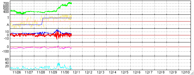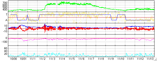 ACEが観測した太陽風の磁場(1番上の枠、白線は全体の強度、赤線は南北成分) および、太陽風の密度(3番目の橙線)、速度(4番目の黄線) (c) NOAA/SEC ![]() シベリアで観測された3日間の磁場データ 右側の3分の1が、昨日のデータになります。グラフが上がったり下がったりすると、オーロラ活動が活発化しています。 (c) NICT ![]() 27日の太陽周期に合わせたデータプロット (太陽風版) 太陽が同じ面を地球に向けていた27日前の変化から、今後を予想することができます。 (c) NICT