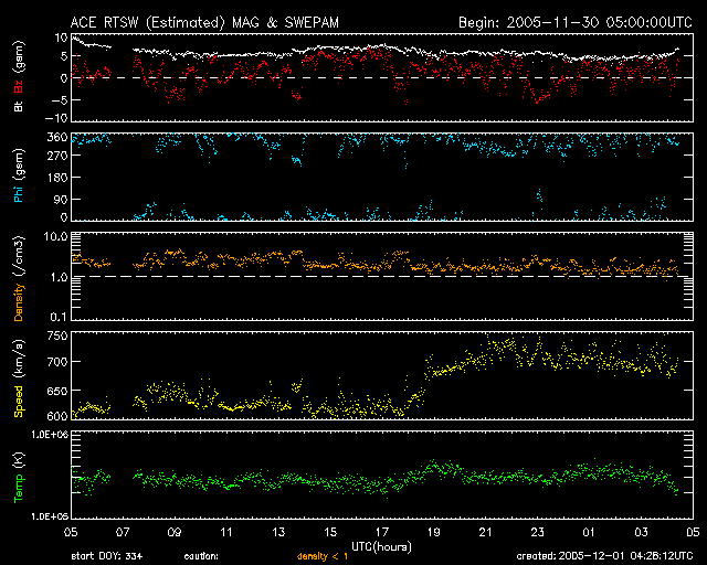 2005/12/ 1 13:30 更新 高速太陽風が続いています(700km/秒)。オーロラもやや活発です。 担当 篠原 コロナホールによる高速太陽風が続いています。 昨日の600km/秒から一段上がって、700km/秒前後で推移しています。 27日周期の図の前周期の変化と比較すると、まさに高速風領域のまっただ中にいるようです。 SOHO EIT284の太陽写真には、太陽の北極付近から真ん中へ向かって、 縦に濃くコロナホールが広がっているのが分かります。 コロナホールの分布を見ると、 コロナホール中心部分の高速風が地球に届くのはこれからという印象です。 前周期では、これから4〜5日程度高速太陽風が続いています。 磁気圏の活動度を決める太陽風磁場の南北成分ですが、 5nTから-5nTの範囲で比較的短時間に振動するような変化を見せています。 このため連続的にオーロラ活動が発生している様です。 ただ、全体としては北向きになっている時間帯の方が長いようで、 シベリアの磁場データを見ると、それほど大きな変化にはなっていません。 やや活発な600nTくらいの変化が観測されている程度です。 それでも、極域ではきれいなオーロラを見る事ができているのではないでしょうか。 今後も高速風は続きますので、その間はオーロラ活動が活発になりやすい状態が続きます。 太陽では826黒点群が成長しています。 今日の未明1日2時半(世界時30日17時半)にM1.4の中規模フレアを起こしました。 GOES衛星のX線のグラフも全体のレベルが上がっています。 今後も中規模フレアを起こす可能性があります。 SOHO衛星のEIT284カメラの映像 (c) SOHO (ESA & NASA)