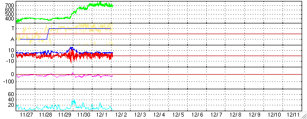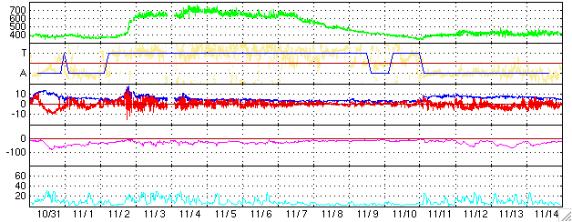 ACEが観測した太陽風の磁場(1番上の枠、白線は全体の強度、赤線は南北成分) および、太陽風の密度(3番目の橙線)、速度(4番目の黄線) (c) NOAA/SEC ![]() 27日の太陽周期に合わせたデータプロット (太陽風版) 太陽が同じ面を地球に向けていた27日前の変化から、今後を予想することができます。 (c) NICT