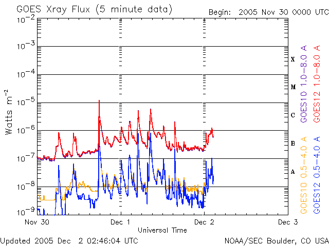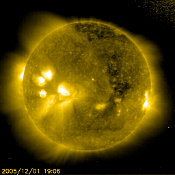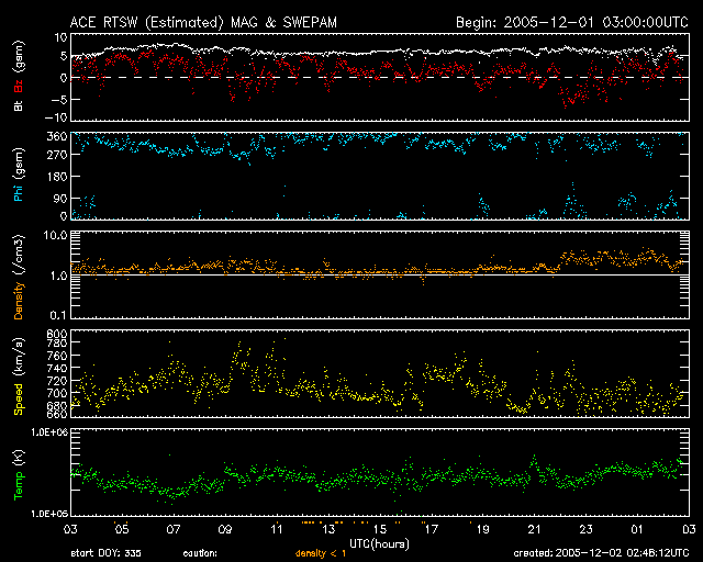 2005/12/ 2 11:50 更新 高速の太陽風が続いています(700km/秒)。826黒点群が小規模フレアを頻繁に起こしています。 担当 篠原 高速の太陽風が続いています。 太陽風は引き続き700km/秒と高速状態を保っています。 27日周期の図を見ると、高速風領域に入って3日目に入った事が分かります。 前周期のデータと比較すると、今日あたりが高速風の中心部にあたる様です。 太陽風の磁場は強度が5nTでほぼ安定しています。 概ね北向きに推移していて、-3〜-5nT程度の南向きが比較的短い時間見られることがあります。 南向きはあまり続きませんが、速度が速いためにオーロラ活動は刺激を受けて、 小規模ですが頻繁に発生している様です。 シベリアの磁場データを見ると、200〜400nTの変化が何度も現れています。 高速太陽風は明日いっぱい続くでしょう。 明後日以降は次第に速度が下がっていきそうです。 磁場強度も落ちて、オーロラ活動は次第に弱まっていくでしょう。 太陽では、826黒点群が活発な活動を続けています。 Cクラスの小規模フレアを何度も発生させています。 Mクラスの中規模フレアを起こす可能性も高まっていますので、注意が必要です。 826黒点群の左に小さな新しい黒点群が現れています。 ここも小規模なフレア活動を見せており、今後の変化に注意が必要でしょう。 SOHO衛星のEIT284カメラの映像 (c) SOHO (ESA & NASA)