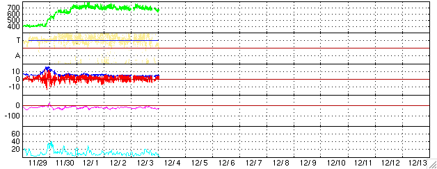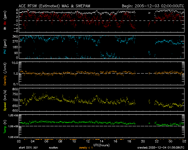 2005/12/ 4 10:59 更新 826黒点群はやや落ち着いています。太陽風の速度は下がり始めました。 担当 篠原 826黒点群の活動はやや落ちついています。 昨日のニュース以降は、Cクラスの小規模フレアを数回起こしただけに留まっています。 826黒点群は規模を縮小しつつあるという情報がありますが、 引き続き注意する必要があるでしょう。 東から新しく上がってきた黒点群は、830という番号が付けられています。 昨日、2日16時半(世界時2日7時半)にC5.3の小規模フレアを起こしました。 大きな黒点群ではありませんでしたので、激しい活動を起こすことはないでしょう。 太陽風は速度をゆっくりと下げ始めています。 700km/秒から650km/秒へ一日かけてゆっくりと変化しています。 今日はさらにその傾向がはっきりして、速度は更に低下を続けるでしょう。 一方、2日から3日にかけて発生した中規模フレアで発生したCME(太陽ガスの放出現象)の影響が、 明日、5日の昼以降に地球へ届く可能性があります。 太陽風の速度が急に上昇し、磁場が乱れる事で、磁気圏の活動を活発にする可能性があります。 その時運ばれて来る、太陽風磁場の南北成分に依存しますが、 南向きが強まると、激しいオーロラ活動や、磁気嵐が発生することがあります。 GOES衛星の太陽X線データ (c) NOAA/SEC ![]() SOHO衛星のMDIカメラによる太陽黒点 (c) SOHO (ESA & NASA) ![]() ACEが観測した太陽風の磁場(1番上の枠、白線は全体の強度、赤線は南北成分) および、太陽風の密度(3番目の橙線)、速度(4番目の黄線) (c) NOAA/SEC ![]() シベリアで観測された3日間の磁場データ 右側の3分の1が、昨日のデータになります。グラフが上がったり下がったりすると、オーロラ活動が活発化しています。 (c) NICT ![]() 27日の太陽周期に合わせたデータプロット (太陽風版) 太陽が同じ面を地球に向けていた27日前の変化から、今後を予想することができます。 (c) NICT