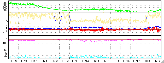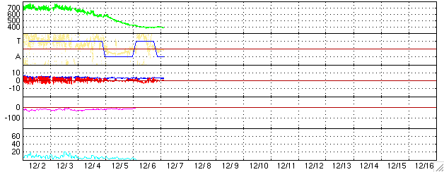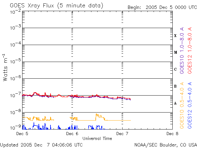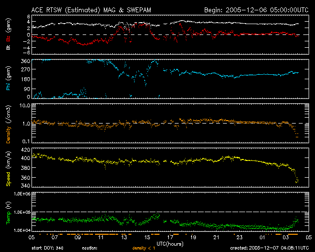 2005/12/ 7 13:06 更新 太陽風、磁気圏ともに穏やかです。太陽のフレア活動も見られません。 担当 篠原 穏やかな太陽風が続いています。 速度は400km/秒からやや下がって、380km/秒くらいになっています。 通常のレベルの速度と言ってよいでしょう。 太陽風の磁場は、強度が3nTで安定しています。 南北成分を見ると、図の前半部で弱い南向きが発生していました。 しかし、シベリアの磁場データなどを見ても、目立った変動はありません。 磁場が小さかったことや、速度が下がっているためでしょうか。 今後の変化について、27日周期の図をご覧下さい。 太陽は27日で自転しています。 このため、27日の周期で太陽風は同じ変化をする傾向があります。 太陽風の周期性を利用することで、27日前のデータを参考にして今後の予想を立てる事ができます。 今日、12月7日の27日前は11月10日です(図の時刻は世界時です)。 11月10日以降の太陽風の速度を見ると、図の最後まで、 10日間にわたって400km/秒前後の穏やかな状態が続いています。 一方、太陽風の磁場強度(青線)は、図の変化ではわずかですが、 11月11日から4日間ほど10nT弱に強まっています。 南北成分(赤線)を見ると、比較的南寄り(マイナス側)になっていることがわかります。 この影響でしょう、速度が低い割に、やや活発な磁気圏の活動が見られています。 図の中では沖縄の磁場データから作成した、 ピンク色の線がマイナスに下がっている事、水色の線が不規則にプラスに増加している事、 などが磁気圏活動の活発化を示しています。 これを今後に対応させると、明日、12月8日頃から太陽風の磁場に変化が現れ始め、 12月11日にかけて、磁気圏活動がやや活発化する可能性があります。 速度が遅いため、大きな活動にはなりませんが、 オーロラが極域の空を飾るには十分なのではないでしょうか。 太陽のフレア活動は穏やかです。 GOES衛星のX線データには何の変化も観測されていません。 826黒点群らの規模も縮小しています。 ACEが観測した太陽風の磁場(1番上の枠、白線は全体の強度、赤線は南北成分) および、太陽風の密度(3番目の橙線)、速度(4番目の黄線) (c) NOAA/SEC ![]() シベリアで観測された3日間の磁場データ 右側の3分の1が、昨日のデータになります。グラフが上がったり下がったりすると、オーロラ活動が活発化しています。 (c) NICT ![]() 27日の太陽周期に合わせたデータプロット (太陽風版) 太陽が同じ面を地球に向けていた27日前の変化から、今後を予想することができます。 (c) NICT