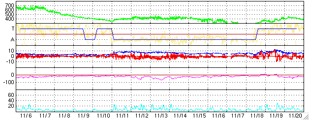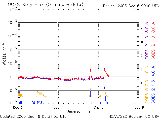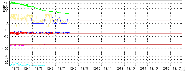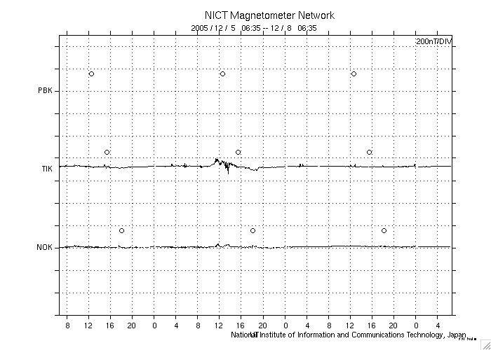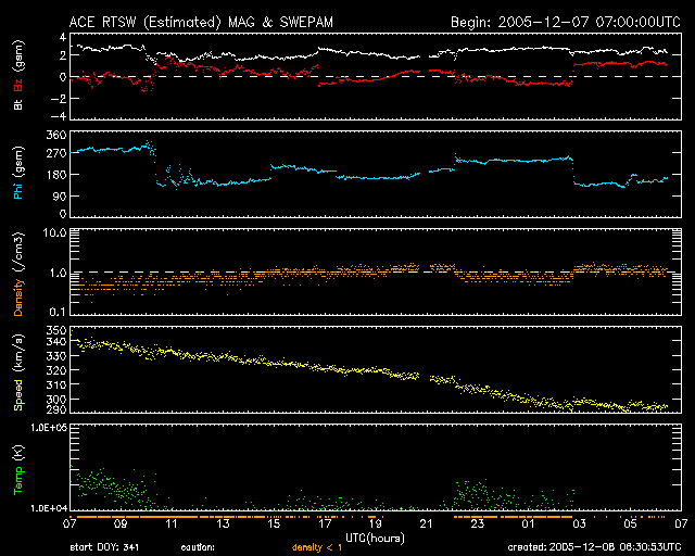 2005/12/ 8 15:35 更新 太陽風はとても低速になっています(300km/秒)。磁気圏もとても穏やかです。 担当 篠原 太陽風の速度はどんどん下がって、300km/秒とかなり遅くなっています。 磁場強度も2nTまで弱まっています。 今日のACEのデータを見ると、磁場の南北成分がプラス寄り、マイナス寄りの間を スイッチが切り替わる様に変化しており、興味深いです。 今のところ、昨日、27日周期の図を用いて解説した、磁場の強まりは見えていません。 今後どのようになるでしょうか。 磁気圏はとても静穏です。 シベリアの磁場データは3日間ほとんど真っ平らです。 非常に静穏な状態が続いています。 太陽では830黒点群がCクラスに届かない規模の小さなフレアを起こしていますが、 静穏と言ってよいでしょう。 黒点群も穏やかなものばかりで、目立ったフレア活動は起こしそうにありません。 宇宙天気はとても静かな状態です。 ACEが観測した太陽風の磁場(1番上の枠、白線は全体の強度、赤線は南北成分) および、太陽風の密度(3番目の橙線)、速度(4番目の黄線) (c) NOAA/SEC ![]() シベリアで観測された3日間の磁場データ 右側の3分の1が、昨日のデータになります。グラフが上がったり下がったりすると、オーロラ活動が活発化しています。 (c) NICT ![]() 27日の太陽周期に合わせたデータプロット (太陽風版) 太陽が同じ面を地球に向けていた27日前の変化から、今後を予想することができます。 (c) NICT