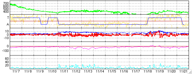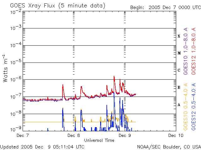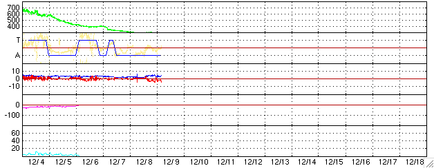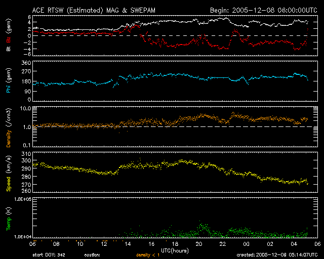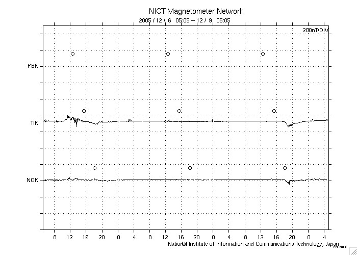 2005/12/ 9 14:17 更新 太陽風はとても低速です(270km/秒)。周期性のある、太陽風磁場の乱れが今回も到来しています。 担当 篠原 太陽風の磁場に変化が発生しています。 ちょうど日が今日に変わるころ、 8日22時(世界時8日13時)から磁場の強度がやや上昇し、 4nTに上がっています(大きな値ではありません)。 そして、南北成分(赤線)が安定的に南(マイナス)を向くようになっています。 南向きは-2〜-4nT程度の大きさで、現在も続いています。 27日周期の図で、発生するかもしれないと予想していた太陽風磁場の乱れです。 太陽風の速度は遅く、300km/秒から更に270km/秒にまで下がっています。 このことと、磁場が南を向き続けていますが小幅なため、 磁気圏の活動は大きなものにはなっていません。 シベリアの磁場データを見ると、とても小さな変化が見えているだけです。 ただし、これは本当の磁気圏の活動度を見ていない可能性があります。 速度が遅くなって、太陽風が穏やかになると、 オーロラの活動する場所が普段より高緯度側に移動してしまいます。 このため、観測のために磁力計を置いている場所では、 北に遠くなってしまったオーロラが、単に見えなくなっているだけかもしれないのです。 今回の太陽風磁場の乱れを27日前のデータと比較すると、 磁場強度の強まりが弱まっています。 この磁場変化は太陽の磁場構造と関係しているのだと思いますが、 その発生源の構造が少しずつ変化しているのでしょう。 前周期はこの乱れが4日ほど続きました。 今回はどうなるでしょうか。 太陽のフレア活動をみると、X線のデータが小規模な活動を示しています。 これは、西に沈みかけている826黒点群たちが起こしているフレアと、 東の端の、まだこちら側に上がってきていない活動領域が起こしているフレアです。 明日、明後日くらいに、新しい黒点群が上がってくると思います。 今日から来週の水曜日まで、アメリカへ出張に行きます(今、中部国際空港にいます)。 ニュースの更新がしばらく不定期になるかもしれません。ご了承ください。 ACEが観測した太陽風の磁場(1番上の枠、白線は全体の強度、赤線は南北成分) および、太陽風の密度(3番目の橙線)、速度(4番目の黄線) (c) NOAA/SEC ![]() シベリアで観測された3日間の磁場データ 右側の3分の1が、昨日のデータになります。グラフが上がったり下がったりすると、オーロラ活動が活発化しています。 (c) NICT ![]() 27日の太陽周期に合わせたデータプロット (太陽風版) 太陽が同じ面を地球に向けていた27日前の変化から、今後を予想することができます。 (c) NICT