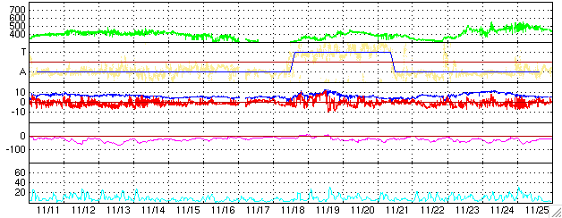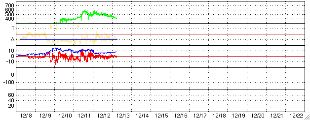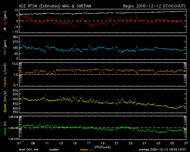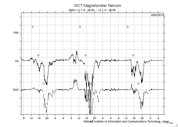 2005/12/13 15:54 更新 太陽風速度は400km/秒に下がっています。オーロラがやや活発でした。 担当 篠原 太陽風の速度はゆっくりと下がり、400km/秒の通常状態に戻りました。 高速風領域は比較的狭く、2日弱で通過した様です。 太陽風の磁場は強度5nTと、こちらも普通の強さで安定しています。 オーロラ活動に重要な南北成分の変化ですが、 今日のACEの図の前半では-3nTほどの弱い南向きが頻繁に見られています。 この影響でしょう、シベリアの磁場データでは500nTほどの 小規模なオーロラ活動が観測されています。 その後は南北成分はほぼ0になり、オーロラも弱っています。 今後は速度も通常レベルが続き、穏やかな状態が続くと予想されます。 SOHO EIT284の観測が止まっているため、コロナホールの最新状況を見る事ができません。 代わりとして、GOES衛星のX線画像から太陽面の様子を判断しています。 太陽のフレア活動は穏やかな状態が続いています。 835黒点群も活動をほとんど止めています。 今後も穏やかに推移するでしょう。 ACEが観測した太陽風の磁場(1番上の枠、白線は全体の強度、赤線は南北成分) および、太陽風の密度(3番目の橙線)、速度(4番目の黄線) (c) NOAA/SEC ![]() シベリアで観測された3日間の磁場データ 右側の3分の1が、昨日のデータになります。グラフが上がったり下がったりすると、オーロラ活動が活発化しています。 (c) NICT ![]() 27日の太陽周期に合わせたデータプロット (太陽風版) 太陽が同じ面を地球に向けていた27日前の変化から、今後を予想することができます。 (c) NICT