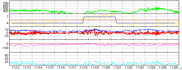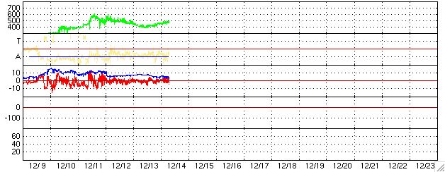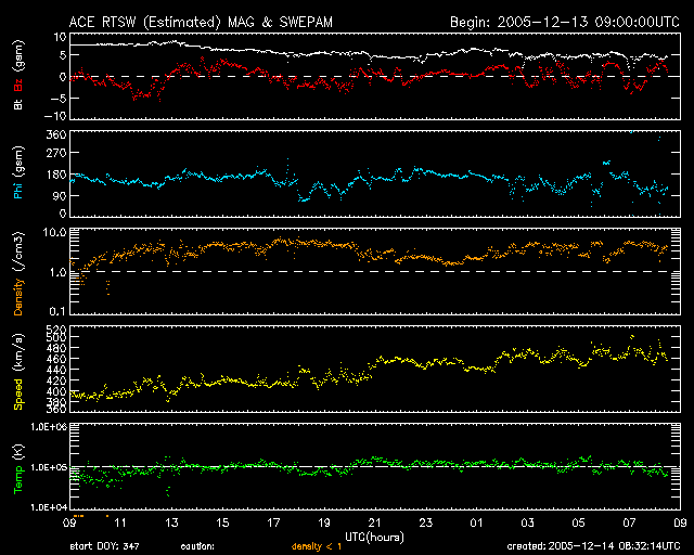 2005/12/14 17:34 更新 太陽風の速度がやや上がっています。磁気圏は穏やかです。 担当 篠原 太陽風の速度がやや上がっています。 昨日400km/秒に下がっていましたが、 今日になってゆっくりと460km/秒くらいまで上昇しています。 3日前の速度上昇もそうでしたが、太陽の様子が変化して、 27日周期とやや外れた変化が目立っています。 ただ、どちらも小幅の変化で、大きな問題ではありません。 太陽風の磁場は7nTから5nTへやや下がっています。 このことから、速度がこれ以上大きく上昇する事はないだろうと思います。 -2〜-3nT程度の小さな南向きが見られている程度ですので、 磁気圏活動に大きな変化は起こしていません。 シベリア磁場データでも小幅の変化が観測されている程度です。 太陽も穏やかな状態が続いています。 黒点群は4つほど見えていますが、どれも穏やかです。 X線のデータで小さなCクラスの小規模フレアが観測されていますが、 これは東の端の向こう側にある黒点群が起こしたものです。 やがてこちら側に上がって来るでしょう。 今日アメリカより帰国して、中部国際空港で更新しています。 明日以降は通常のペースで記事を更新します。 ACEが観測した太陽風の磁場(1番上の枠、白線は全体の強度、赤線は南北成分) および、太陽風の密度(3番目の橙線)、速度(4番目の黄線) (c) NOAA/SEC ![]() シベリアで観測された3日間の磁場データ 右側の3分の1が、昨日のデータになります。グラフが上がったり下がったりすると、オーロラ活動が活発化しています。 (c) NICT ![]() 27日の太陽周期に合わせたデータプロット (太陽風版) 太陽が同じ面を地球に向けていた27日前の変化から、今後を予想することができます。 (c) NICT