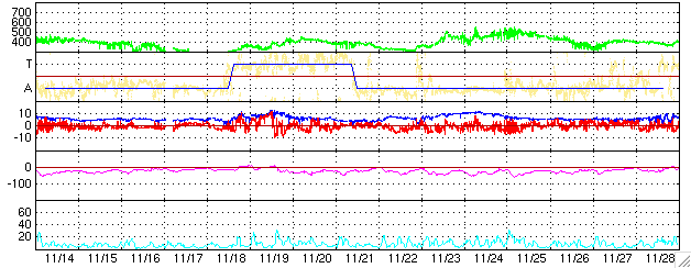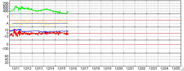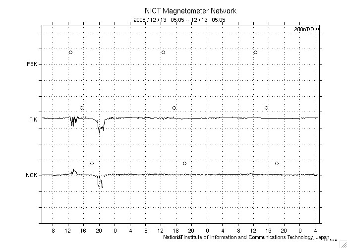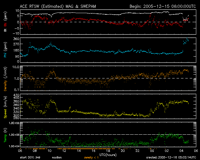 2005/12/16 14:05 更新 太陽風のセクター境界を越えつつある様です。磁気圏はとても穏やかです。 担当 篠原 地球は、太陽風のセクター境界を通過しつつある様です。 ACEのグラフの右端で、水色の線(太陽風の磁場の方向を示しています)が、 ポンと跳ねた様に変化しています。 まだ、もうしばらく様子を見る必要がありますが、昨日のニュースでお知らせしたような、 太陽風磁場の変化が起こっているのだと思います。 太陽風の速度は、昨夜から300km/秒くらいまで下がった状態が続き、 現在は380km/秒くらいに上がっています。 通常の速度レベルに戻ったという程度です。 磁場のグラフは、強度(白線)は7nTくらいが続いていましたが、 最後のところで急に強度が0近くに下がっています。 この変化はセクター境界と関連した変化でしょう。 現在の磁気圏はとても穏やかです。 速度が下がっていたことや、磁場も概ね北寄りに推移していたためです。 セクター境界を越えた事で、今後どのように様子が変わるか注目されます。 (ただし、大きな乱れが発生する事はありません) 太陽はとても穏やかです。 フレア活動はごく小さな輝きが観測されている程度です。 ACEが観測した太陽風の磁場(1番上の枠、白線は全体の強度、赤線は南北成分) および、太陽風の密度(3番目の橙線)、速度(4番目の黄線) (c) NOAA/SEC ![]() 27日の太陽周期に合わせたデータプロット (太陽風版) 太陽が同じ面を地球に向けていた27日前の変化から、今後を予想することができます。 (c) NICT