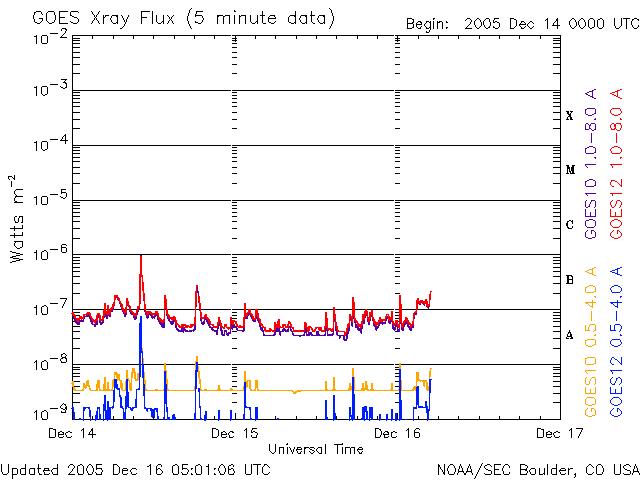 右側の3分の1が、昨日のデータになります。グラフが上がったり下がったりすると、オーロラ活動が活発化しています。 (c) NICT ![]() SOHO衛星のMDIカメラによる太陽黒点 (c) SOHO (ESA & NASA) ![]() GOES衛星の太陽X線データ (c) NOAA/SEC ![]() | |||||||||||||||||||||||||||||||||||||||||||||||||||||||