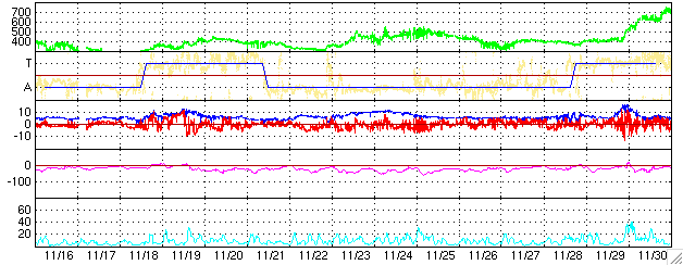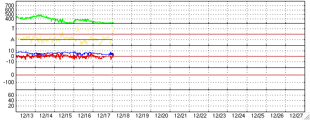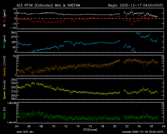 2005/12/18 12:06 更新 太陽風は310km/秒ととても低速です。太陽フレアも穏やかな状態が続いています。 担当 篠原 穏やかな太陽風が続いています。 昨日以降、速度は320km/秒から310km/秒とやや下がりながら、遅い状態を続けています。 磁場強度は5nTと普通の強さが続いています。 今日のACEの図の、前半部分では磁場が南寄りになったり、 最後の部分では南北に乱れたりなどの変化は発生しています。 しかし、速度が遅いため地球への影響は小さなものに留まっています。 シベリアの磁場データは200nTくらいの小さな変化を記録しているだけですし、 その他のデータでも磁気圏活動が観測されていますが、小規模です。 太陽風の状況が前周期と微妙に異なってきているため、今後の展開が予想しづらいのですが、 明日くらいまでは穏やかに推移するのではないでしょうか。 その後、速度の小規模な増加などが見られるかもしれません。 SOHO EIT284の太陽写真が休止したままですので、コロナホールの最新状況が分かりません。 太陽のフレア活動は穏やかです。 836黒点群が西に没し、掲載の写真では2つの黒点群が残ります。 (実際には、837群という小さな黒点群もある様です) こちらも穏やかな状態が続くでしょう。 ACEが観測した太陽風の磁場(1番上の枠、白線は全体の強度、赤線は南北成分) および、太陽風の密度(3番目の橙線)、速度(4番目の黄線) (c) NOAA/SEC ![]() シベリアで観測された3日間の磁場データ 右側の3分の1が、昨日のデータになります。グラフが上がったり下がったりすると、オーロラ活動が活発化しています。 (c) NICT ![]() 27日の太陽周期に合わせたデータプロット (太陽風版) 太陽が同じ面を地球に向けていた27日前の変化から、今後を予想することができます。 (c) NICT