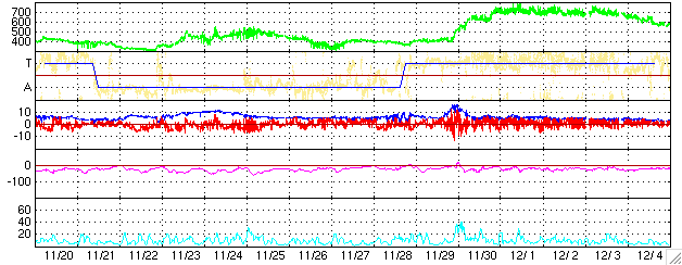 ACEが観測した太陽風の磁場(1番上の枠、白線は全体の強度、赤線は南北成分) および、太陽風の密度(3番目の橙線)、速度(4番目の黄線) (c) NOAA/SEC ![]() 27日の太陽周期に合わせたデータプロット (太陽風版) 太陽が同じ面を地球に向けていた27日前の変化から、今後を予想することができます。 (c) NICT