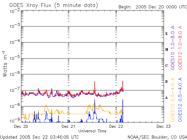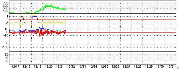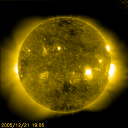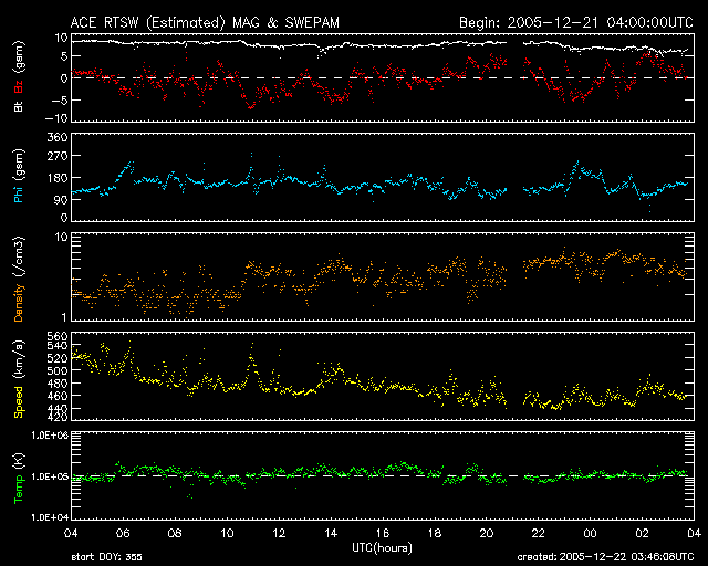 2005/12/22 12:50 更新 太陽風の速度は低下を続けています。オーロラはやや活発です。 担当 篠原 今日は冬至です。 宇宙天気に季節は関係なさそうに思われますが、 地球の自転軸の太陽に対する傾き具合が変化するために、統計的には影響が見られます。 例えば、春と秋は宇宙天気が乱れやすくなるという傾向が知られています。 地球はコロナホールの高速風領域を抜けつつあります。 太陽風の速度は順調に低下を続けていて、450km/秒まで下がりました。 速度の低下は一旦止まった様に見えますが、今後もゆっくりと低下する傾向を示すと思われます。 27日周期の図を参考にすると、もう1〜2日ほどかけて400km/秒まで下がっていくのではないでしょうか。 その後、低速状態が3日ほど続いて、次の高速風がやってきそうです。 SOHO EIT284の太陽写真の、左端付近にほんのり暗くコロナホールらしき影が見えています。 これが太陽の中心に進み、速度の高い太陽風を地球にもたらします。 速度の上昇は12月27日くらいになりそうです。 シベリアの磁場データを見ると、オーロラ活動はやや活発に続いている様です。 500nTくらいの変化が観測されています。 太陽風の磁場変化を見ると、磁場強度が8nTとやや強く、 南北成分が-5nTくらいの大きさで南を向く事が度々見られています。 その影響でしょう。 今後は速度が低下して行き、磁場強度も弱まっていくと思われますので、 オーロラ活動もより低調になっていくでしょう。 太陽はとても穏やかです。 837黒点群もやや小さくなった様に見えます。 SOHO衛星のEIT284カメラの映像 (c) SOHO (ESA & NASA)