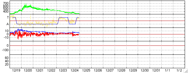 ACEが観測した太陽風の磁場(1番上の枠、白線は全体の強度、赤線は南北成分) および、太陽風の密度(3番目の橙線)、速度(4番目の黄線) (c) NOAA/SEC ![]() シベリアで観測された3日間の磁場データ 右側の3分の1が、昨日のデータになります。グラフが上がったり下がったりすると、オーロラ活動が活発化しています。 (c) NICT ![]() 27日の太陽周期に合わせたデータプロット (太陽風版) 太陽が同じ面を地球に向けていた27日前の変化から、今後を予想することができます。 (c) NICT