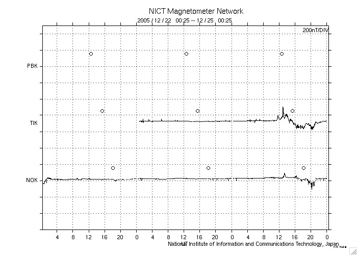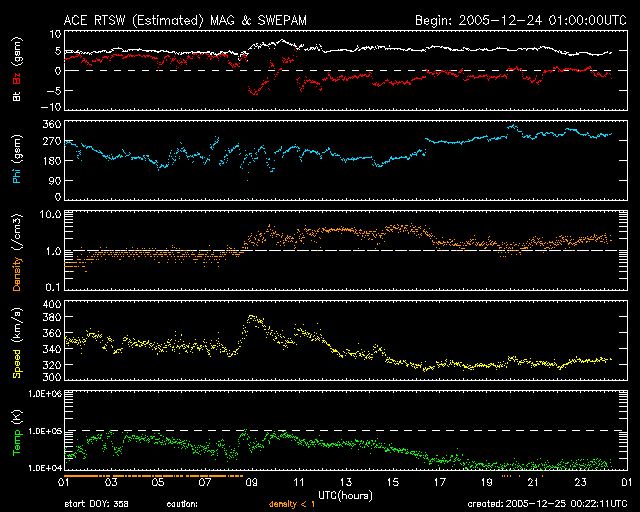 2005/12/25 09:25 更新 低速太陽風が続いています(320km/秒)。南向き太陽風磁場の影響で、弱いオーロラ活動が見えていた様です。 担当 篠原 低速の太陽風が続いています。 340km/秒から320km/秒に更に下がっています。 一方、太陽風磁場の南北成分(赤線)に、 北寄りが続く状況から南寄りが続く状況への変化が見られました。 このため、磁気圏に弱いながらもエネルギーの流れ込みがあったと思われます。 シベリアの磁場データを見ると、振幅はわずかですが、10時間にわたって変化が見えています。 この様な穏やかな時には、これらの観測点よりも高緯度側でオーロラ活動が発生していて、 実際にはもう少し強い活動が発生している可能性があります(それでも弱い活動です)。 SOHO EIT284の太陽写真では、コロナホールが次第に太陽の中心に進んでいます。 コロナホールは太陽の磁場が外へ向かって開いている場所です。 ここからは速度の高い太陽風が外へ向かって飛び出してきます。 写真を見ると、コロナホールの右端がそろそろ太陽の中心に達します。 すると、通常は3日後くらいに速度の高い太陽風が地球へ来ます。 今回のコロナホールでは、27日周期の図を見るともう一日早く、 明後日の27日くらいに高速風が地球へ到達しそうです。 上昇に先立って磁場強度が強まり、南向き成分が強まるとオーロラ活動が活発になります。 高速風は5〜6日ほど続くでしょう。 太陽のフレア活動はとても穏やかです。 黒点群の規模にも大きな変化は見えません。 SOHO衛星のEIT284カメラの映像 (c) SOHO (ESA & NASA)