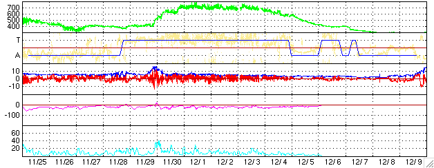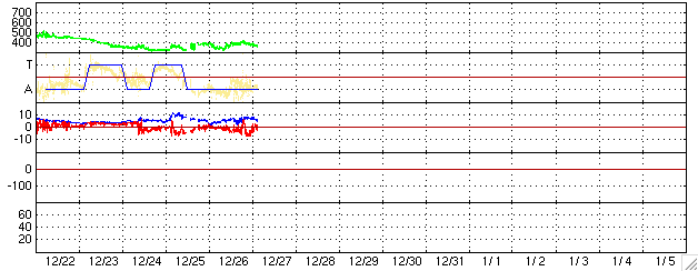 ACEが観測した太陽風の磁場(1番上の枠、白線は全体の強度、赤線は南北成分) および、太陽風の密度(3番目の橙線)、速度(4番目の黄線) (c) NOAA/SEC ![]() シベリアで観測された3日間の磁場データ 右側の3分の1が、昨日のデータになります。グラフが上がったり下がったりすると、オーロラ活動が活発化しています。 (c) NICT ![]() 27日の太陽周期に合わせたデータプロット (太陽風版) 太陽が同じ面を地球に向けていた27日前の変化から、今後を予想することができます。 (c) NICT