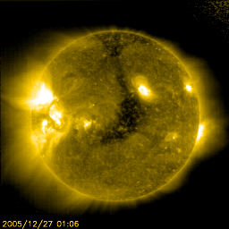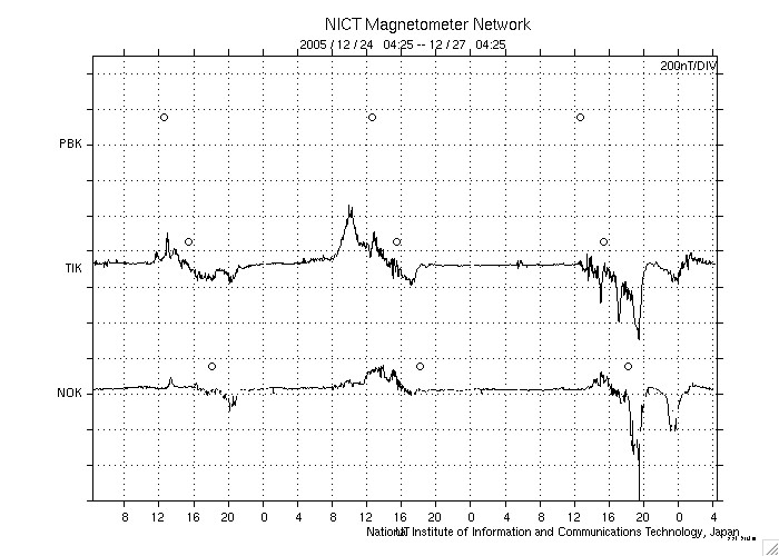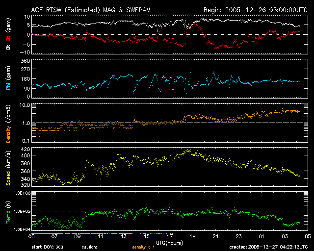 2005/12/27 13:26 更新 再び、太陽風磁場の南向きが発生し、オーロラ活動がやや活発になりました。これからコロナホールによる高速風が始まります。 担当 篠原 この2日ほど、太陽風が面白い変化を続けています。 昨日のニュース以降も、太陽風磁場が再び南向きになり、 -5nT前後が長時間続く変化が見られました。 一昨日と似た変化になっています。 太陽風の速度は一旦400km/秒に上がり、現在は360km/秒に下がっています。 概ね通常の速度だったと言ってよいでしょう。 南向き磁場の影響で、磁気圏の活動がやや強まりました。 シベリアの磁場データでは400nTくらいの小規模な変化が観測されています。 磁気圏活動が発生した時刻との関係ですが、アラスカのライブカメラで見えたオーロラは、 昨日紹介したものよりも小規模で、高緯度側に低く見えるものでした。 太陽風磁場の南向きは半日ほど続き、現在は弱まって0nT付近になっています。 SOHO EIT284の太陽写真で、コロナホールが太陽の中心にどんと見えています。 北極に向かって、細長く伸びています。 ここから吹き出している高速の太陽風が、まもなく地球に到達すると予想されます。 27日周期の図を参考にすると、いつ速度の増加が始まっても良さそうです。 太陽では、東側(左側)に黒点群が多く分布して、にぎやかになっています。 上で紹介したSOHO EIT284の写真でも、この部分がとても明るく輝いているのが分かります。 ただ、フレア活動は起こしておらず、穏やかな太陽です。 SOHO衛星のEIT284カメラの映像 (c) SOHO (ESA & NASA)