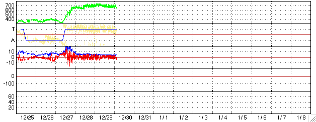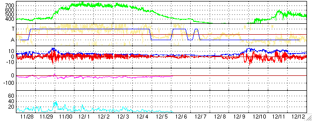 ACEが観測した太陽風の磁場(1番上の枠、白線は全体の強度、赤線は南北成分) および、太陽風の密度(3番目の橙線)、速度(4番目の黄線) (c) NOAA/SEC ![]() シベリアで観測された3日間の磁場データ 右側の3分の1が、昨日のデータになります。グラフが上がったり下がったりすると、オーロラ活動が活発化しています。 (c) NICT ![]() 27日の太陽周期に合わせたデータプロット (太陽風版) 太陽が同じ面を地球に向けていた27日前の変化から、今後を予想することができます。 (c) NICT