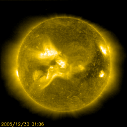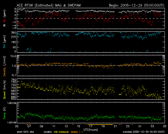 2005/12/30 13:34 更新 高速の太陽風が続いています(650km/秒)。磁気圏活動はやや穏やかになっています。 担当 篠原 今年も残すところ2日となりました。 今年も宇宙天気ニュースをご利用いただいてありがとうございました(明日も更新しますが)。 来年もよろしくお願い致します。 今日の太陽風は、速度を650km/秒に下げつつも高速状態を保っています。 この高速風の原因であるコロナホールは、SOHO EIT284の太陽写真ではだいぶ西に移動しています。 地球への影響としては、中心部をやや過ぎたくらいになりそうです。 27日周期の図を参考にすると、もう2〜3日高速状態が続くでしょう。 1年の締めくくりという訳ではありませんが、 今回の高速太陽風をもたらしているコロナホールの今年一年の変化を見てみましょう。 今日の1枚目の写真は、2005年の1月から今月までのSOHO EIT284写真を、 27日毎に重ねて動画にしたものです。 撮影日時が左下に入っています。 1月に大きく逆三角に見えていたコロナホールが大きさや形を変えていく様子が良くわかります。 1月のコロナホールと12月のコロナホールを同じものと呼んでいいのかどうか、 私には正確には判断できませんが、太陽の磁場構造が時間をかけて次第に変化して、 その影響でコロナホールが形をゆっくりと変えて行く様子をこの動画は示しています。 さて、太陽風の速度は高速のままでしたが、シベリアの磁場変化は昨日よりも小規模になっています。 太陽風磁場の変化が、細かい振動を続けつつもやや北寄りに変わったように見えますが、 その影響でしょうか。 その他のデータを参考にしても、磁気圏の活動はややおとなしくなっている様です。 今後は、速度の低下にともなって、更に穏やかになって行くでしょう。 放射線帯の高エネルギー電子が増加を続けています。 昨日の図よりも今日の図では、より安定して高いレベルにグラフがとどまっています。 今後、更に増加する可能性がありますので、変化に注意してください。 太陽は穏やかな状態が続いています。 841群が小さなCクラスの小規模フレアを1度起こしていますが、 これ以上の大きな規模の活動をすることはなさそうです。 SOHO衛星EIT 284カメラによる、2005年1月から2005年12月までのコロナホールの長期変化。 (c) ESA & NASA ![]() SOHO衛星のEIT284カメラの映像 (c) SOHO (ESA & NASA)