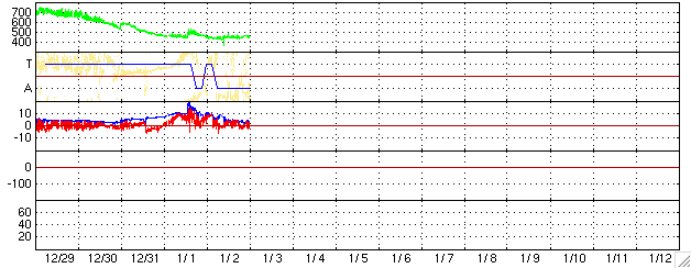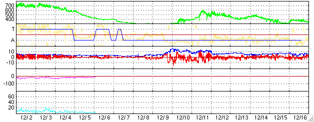 ACEが観測した太陽風の磁場(1番上の枠、白線は全体の強度、赤線は南北成分) および、太陽風の密度(3番目の橙線)、速度(4番目の黄線) (c) NOAA/SEC ![]() シベリアで観測された3日間の磁場データ 右側の3分の1が、昨日のデータになります。グラフが上がったり下がったりすると、オーロラ活動が活発化しています。 (c) NICT ![]() 27日の太陽周期に合わせたデータプロット (太陽風版) 太陽が同じ面を地球に向けていた27日前の変化から、今後を予想することができます。 (c) NICT