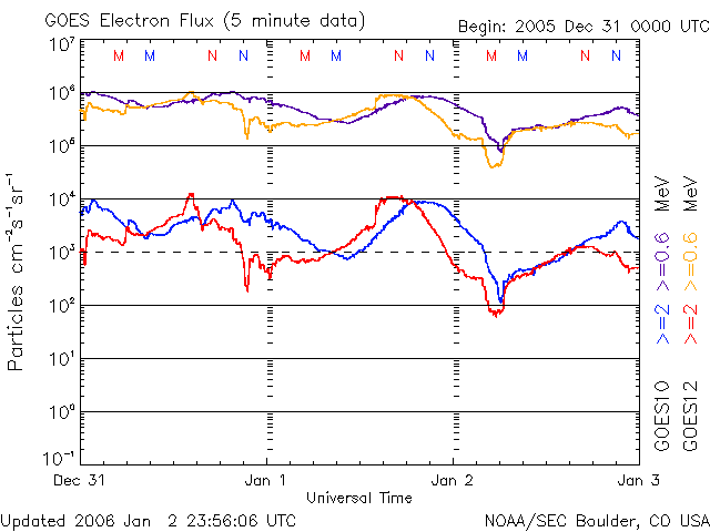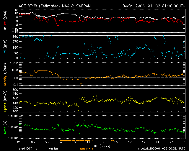 2006/ 1/ 3 10:03 更新 太陽風は穏やかです。速度は450km/秒です。磁気圏の活動も穏やかです。 担当 篠原 太陽風は概ね穏やかな状態に戻っています。 速度は450km/秒とやや速めの状態で安定しています。 また、磁場強度は3nTに下がりました。 南北成分は概ね北向きですが、弱い南向きが続く時間帯も見られています。 このため、磁気圏活動は概ね穏やかでしたが、 GOES衛星の磁場変化を見ると小規模の活動も発生している様です。 シベリアの磁場データは静かで、ほとんど変化を捉えていません。 太陽風は引き続き穏やかな状態が続くでしょう。 SOHO EIT284の写真に小さなコロナホールが見えていましたので、 その影響がいくらか見られるかもしれません。 それが無ければこれから3日程度静かなままでしょう。 放射線帯の高エネルギー電子は減少しています。 警戒ラインから下がっています。 太陽のフレア活動も穏やかです。 X線のグラフには変化は観測されていません。 黒点群は西側に見えているものばかりで、変化は見られません。 SOHO衛星のEIT284カメラの映像 (c) SOHO (ESA & NASA)