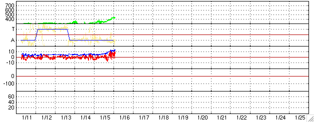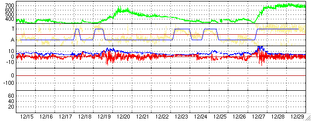 ACEが観測した太陽風の磁場(1番上の枠、白線は全体の強度、赤線は南北成分) および、太陽風の密度(3番目の橙線)、速度(4番目の黄線) (c) NOAA/SEC ![]() シベリアで観測された3日間の磁場データ 右側の3分の1が、昨日のデータになります。グラフが上がったり下がったりすると、オーロラ活動が活発化しています。 (c) NICT ![]() 27日の太陽周期に合わせたデータプロット (太陽風版) 太陽が同じ面を地球に向けていた27日前の変化から、今後を予想することができます。 (c) NICT