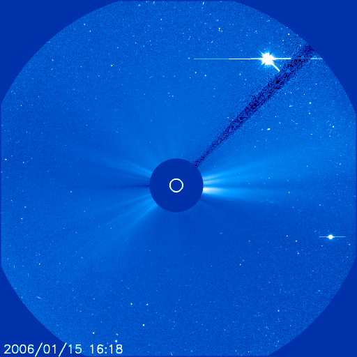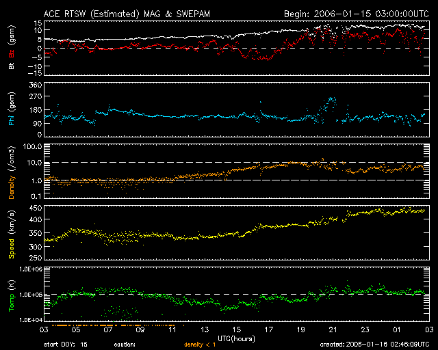 2006/ 1/16 11:50 更新 コロナホールの影響が始まりました。太陽風は430km/秒へ速度が上昇しています。引き続き上がりそうです。 担当 篠原 10日のニュースで、SOHO衛星のLASCO C3カメラに金星が見えてきたことをお伝えしましたが、 金星はその後太陽の上の方を通過し、視野を去りつつあります。 そして、続いて右下に水星の姿が見えてきました。 ちょうど今、地球-金星-太陽-水星とほぼ一列に並んでいるのです。 この動画を見ると、金星が右に、水星が左に動いている様子が良くわかります。 さて、コロナホールによる高速風がやってきました。 ACE衛星の観測によると、太陽風の速度は昨夜よりゆっくりと上昇を始め、 330km/秒から430km/秒くらいまで上がっています。 昨日のニュースに書いた様に、本格的な速度上昇とともに、太陽風の磁場強度も強まっています。 磁場強度は5nTから12nTくらいまで上がっています。 磁場強度はまだ上昇傾向にあるので、速度ももう一段上がるのではないかと思われます。 27日前のデータを参考にすると、今夜くらいに最大値に達しそうです。 前周期は600km/秒くらいまで上昇しました。 速度が上がっていますが、太陽風磁場は北寄りになっていて、磁気圏の活動度はあまり上がっていません。 シベリアのデータも、小規模の変動を捉えている程度です。 今後、磁場が南寄りに切り替わると、そこからオーロラ活動も活発化するでしょう。 高速風は3日程度続きそうです。 太陽では、中心とやや右寄りの2カ所に新しい小さな黒点群が発生しました。 846、847黒点群と番号が付いた様です。 この影響で、X線のグラフが上昇しています。 ただ、どちらも小規模な黒点群で、現時点では特に高い活動レベルにある訳ではありません。 基本的には穏やかな太陽状態が続いています。 内合を過ぎて去りつつある金星(右上)と、これから外合に向かう水星(右下)。SOHO LASCO C3カメラ。 (c) ESA & NASA ![]() SOHO衛星のEIT284カメラの映像 (c) SOHO (ESA & NASA)
