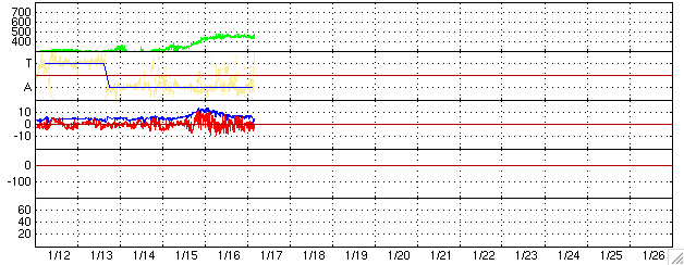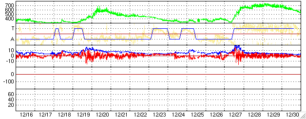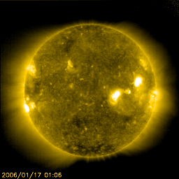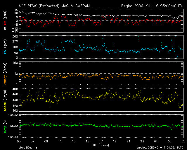 2006/ 1/17 14:03 更新 450km/秒のやや高速の太陽風が続いています。高速風帯は小規模になってしまったようです。 担当 篠原 コロナホールによる太陽風速度の上昇は、450km/秒のところで止まってしまいました。 昨日よりほぼ1日、この速度のままで安定しています。 太陽風磁場の強まりも昨日のニュースくらいまでだったようで、 その後低下し、現在は5nTと普通のレベルに戻っています。 速度と磁場強度の変化は、27日周期の図を見ると分かりやすいと思います。 緑色の線の太陽風速度が上昇しているところで、太陽風の磁場(IMF)強度の青線が盛り上がり、 その後下がっているのが分かります。 それほど高速にはなりませんでしたが、速度上昇の影響でオーロラ活動も活発化しています。 太陽風磁場の南北成分の変化も、-5nTくらいの南向きが頻繁に見られています。 このため、シベリアの磁場データで600nTくらいの活発な活動が見られていました。 アラスカのライブカメラでも、 全天を覆うようなにぎやかなオーロラの活動が久しぶりに見られています。 磁場強度が既に弱まった事や、高速風の最高値が下がっていることなどから、 高速風領域は小規模になっていて、オーロラの活動も短期間で終わってしまいそうです。 太陽では846、847黒点群が小さな黒点の数を増やしている様です。 全体的なフレアの活動度は全く上がっておらず、穏やかな太陽が続いています。 SOHO衛星のEIT284カメラの映像 (c) SOHO (ESA & NASA)
