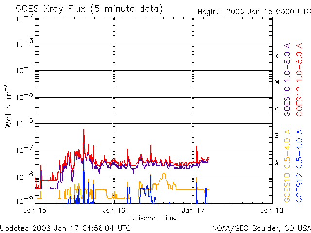 右側の3分の1が、昨日のデータになります。グラフが上がったり下がったりすると、オーロラ活動が活発化しています。 (c) NICT ![]() SOHO衛星のMDIカメラによる太陽黒点 (c) SOHO (ESA & NASA) ![]() GOES衛星の太陽X線データ (c) NOAA/SEC ![]() | ||||||||||||||||||||||||||||||||||||||||||||||||||||||||