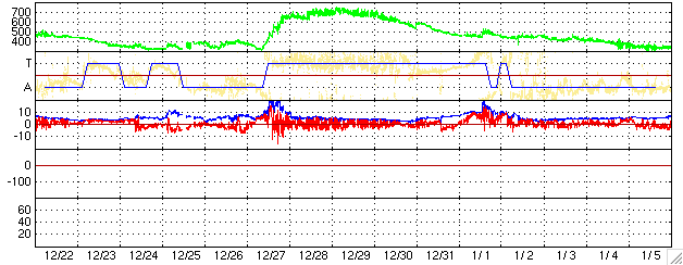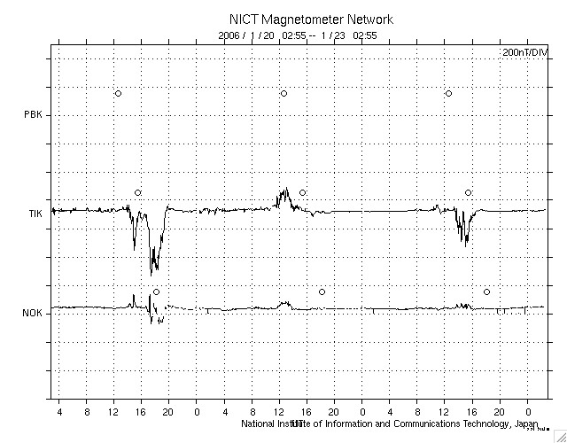 右側の3分の1が、昨日のデータになります。グラフが上がったり下がったりすると、オーロラ活動が活発化しています。 (c) NICT ![]() | |||||||||||||||||||||||||||||||||||||||||||||||||||||||