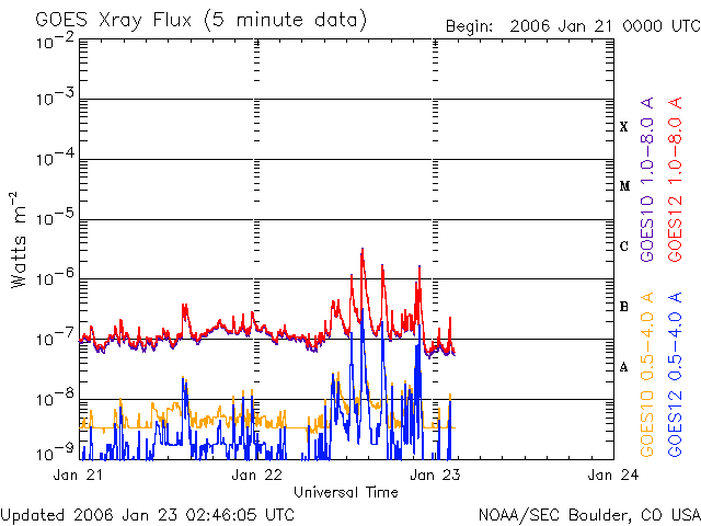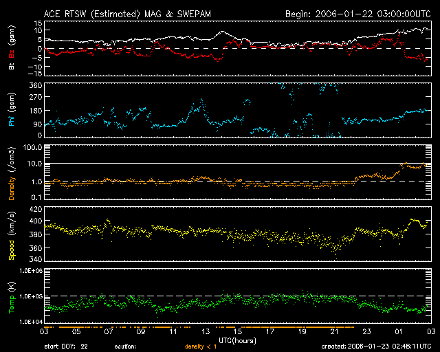 2006/ 1/23 11:53 更新 昨夜、C4の小規模フレアが発生しました。コロナホールの影響で太陽風の速度が上昇を始めそうです。 担当 篠原 848黒点群がCクラスの小規模フレアを発生させています。 22日23時(世界時22日14時)のC4.1を最大として、5回ほど小規模フレアを起こしました。 848群は昨日よりも発達していて、今後、中規模フレアを起こす可能性もあるそうです。 太陽風は、コロナホールによる高速風の兆しが見えています。 ACE衛星のデータを見ると、23日7時(世界時22日22時)くらいから磁場強度が強まり始め、 現在10nTにまで強まっています。 速度上昇の前触れの変化だと思われます。 27日周期の図を参考に見てください。 ちょうど1周期前の12月27日に磁場強度が強まって、速度が上昇するという変化が観測されています。 これと同様の変化が始まっているのではないでしょうか。 前周期は、高速風は最大700km/秒に達し、4日ほど続きました。 昨日のニュースに書いた様に、今回、コロナホールの分布が変化しています。 どのような高速風がやってくるのか興味が持たれます。 ちょうど今、太陽風磁場が-5nTとしっかり南を向いています。 このため、磁気圏の活動度が上昇していると思われます。 今後、速度が上昇を始めた頃にも、この様に太陽風磁場が南向き傾向を続けると、 磁気圏のオーロラ活動は更に活発になるでしょう。 GOES衛星の太陽X線データ (c) NOAA/SEC ![]() SOHO衛星のMDIカメラによる太陽黒点 (c) SOHO (ESA & NASA) ![]() ACEが観測した太陽風の磁場(1番上の枠、白線は全体の強度、赤線は南北成分) および、太陽風の密度(3番目の橙線)、速度(4番目の黄線) (c) NOAA/SEC ![]() 27日の太陽周期に合わせたデータプロット (太陽風版) 太陽が同じ面を地球に向けていた27日前の変化から、今後を予想することができます。 (c) NICT
