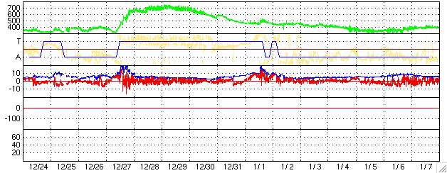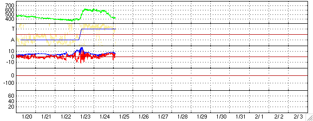 ACEが観測した太陽風の磁場(1番上の枠、白線は全体の強度、赤線は南北成分) および、太陽風の密度(3番目の橙線)、速度(4番目の黄線) (c) NOAA/SEC ![]() 27日の太陽周期に合わせたデータプロット (太陽風版) 太陽が同じ面を地球に向けていた27日前の変化から、今後を予想することができます。 (c) NICT