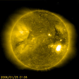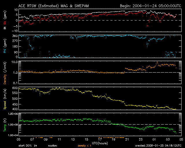 2006/ 1/25 13:23 更新 地球は高速風帯を過ぎました。太陽風の速度は400km/秒に下がっています。 担当 篠原 高速の太陽風は、かなり短期間で終わってしまいました。 25日1時(世界時24日16時)くらいに速度の低下が始まり、 それまでの600km/秒から4時間ほどで450km/秒に下がり、 現在は400km/秒と通常の速度に戻っています。 地球が高速風帯に入っていたのは、1日半くらいでした。 27日周期の図で、前周期の高速風(12月27日〜)との違いを比べてください。 コロナホールの影響域はすっかりしぼんでいた様です。 速度が下がり始める頃から、太陽風の磁場はしっかりとした北向きになっていました。 そのため、磁気圏の活動は(速度が高かったのですが)おとなしくなっていました。 シベリアの磁場データは全く変化が見えていません(右端の3分の1が、最新の24時間分のデータです)。 予想よりもずいぶん早く高速風を抜けてしまいましたが、 SOHO EIT284の太陽写真を見ると、太陽の中心付近にはコロナホールは見られませんので、 太陽風は当面穏やかな状態が続くと思われます。 SOHOの写真では、東側(左側)はコロナのガスがもやもやしていて、様子がよくわかりません。 もう2、3日すると、この辺りの様子もはっきり見えて、 その先の予想もできるようになるでしょう。 太陽では、848黒点群は規模を保っていますが、 この24時間ではC1の小さな小規模フレアを起こしただけです。 黒点写真を見ると、848群は黒点が連なってきれいな姿になっています。 引き続き、小規模フレアを起こす可能性があるそうです。 一方、高速風帯を過ぎましたので、次は放射線帯の高エネルギー電子に注意が必要です。 これから警戒レベルまで増加する可能性がありますので、注目してください。 SOHO衛星のEIT284カメラの映像 (c) SOHO (ESA & NASA)