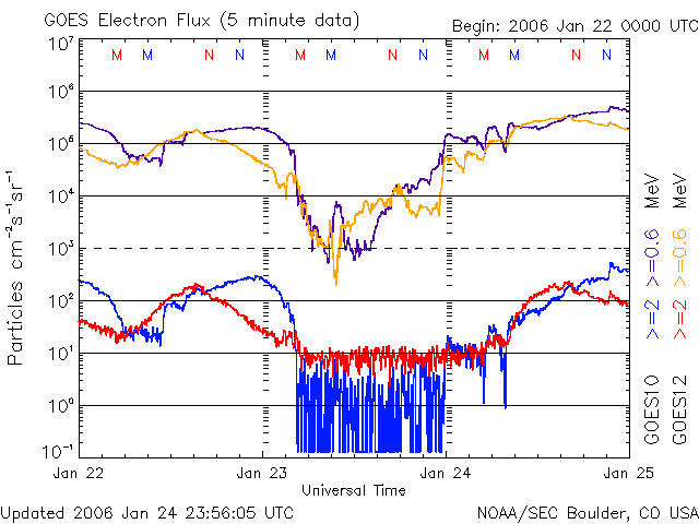 右側の3分の1が、昨日のデータになります。グラフが上がったり下がったりすると、オーロラ活動が活発化しています。 (c) NICT ![]() GOES衛星の太陽X線データ (c) NOAA/SEC ![]() SOHO衛星のMDIカメラによる太陽黒点 (c) SOHO (ESA & NASA) ![]() GOES衛星による、静止衛星軌道における高エネルギー電子の変化 (c) NOAA/SEC ![]() | ||||||||||||||||||||||||||||||||||||||||||||||||||||||||