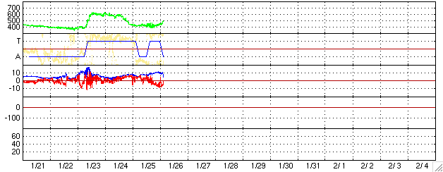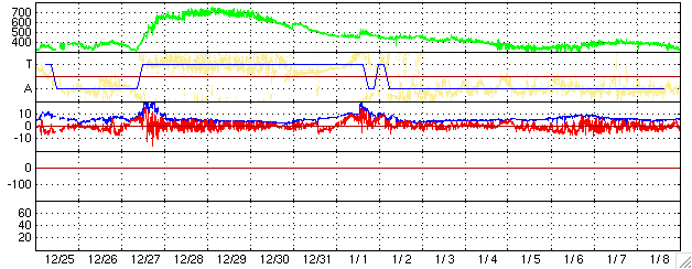 ACEが観測した太陽風の磁場(1番上の枠、白線は全体の強度、赤線は南北成分) および、太陽風の密度(3番目の橙線)、速度(4番目の黄線) (c) NOAA/SEC ![]() シベリアで観測された3日間の磁場データ 右側の3分の1が、昨日のデータになります。グラフが上がったり下がったりすると、オーロラ活動が活発化しています。 (c) NICT ![]() 27日の太陽周期に合わせたデータプロット (太陽風版) 太陽が同じ面を地球に向けていた27日前の変化から、今後を予想することができます。 (c) NICT