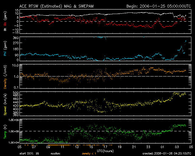 2006/ 1/26 13:25 更新 太陽風磁場が乱れて、磁気圏活動が活発になりました。現在は穏やかになっています。 担当 篠原 速度が下がって、落ち着いたと思われた太陽風ですが、 急に南向き磁場が強まるという乱れが発生しています。 ACE衛星のデータを見ると、昨日の昼、25日15時(世界時25日6時)ころから、 太陽風の磁場強度がゆっくりと強まり、半日ほどかけて10nTに達しました。 そして、26日2時(世界時25日17時)から、南北成分(赤線)がはっきりと南(マイナス)を向き、 以後10時間にわたって-5nT程度の南向きが続きました。 この影響で、磁気圏の活動が強められ、AE指数で1000nTくらいの活発な変動が観測されています。 ACEデータの最新のところ(図の右端)を見ると、 現在の磁場は、強度が下がり、北向きに変わっています。 このため、磁気圏の活動度も現在は下がっているでしょう。 一方、一旦下がっていた速度がまた上昇しています。 現在500km/秒近くにまで上がっています。 恐らく、この乱れは一時的な現象だと思います。 比較的短時間で速度はまた下がって行くでしょう。 SOHO EIT284の太陽写真で、太陽の東側(左側)に細いコロナホールがあることが見えて来ました。 短期間の太陽風の乱れを地球にもたらすかもしれません。 まだ、4、5日先です。 この乱れの影響で、放射線帯の高エネルギー電子は密度を下げています。 太陽は静穏です。 848黒点群は規模がいくらか小さくなっています。 このまま穏やかな状態が続きそうです。 SOHO衛星のEIT284カメラの映像 (c) SOHO (ESA & NASA)