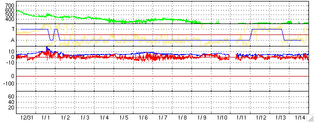 ACEが観測した太陽風の磁場(1番上の枠、白線は全体の強度、赤線は南北成分) および、太陽風の密度(3番目の橙線)、速度(4番目の黄線) (c) NOAA/SEC ![]() シベリアで観測された3日間の磁場データ 右側の3分の1が、昨日のデータになります。グラフが上がったり下がったりすると、オーロラ活動が活発化しています。 (c) NICT ![]() 27日の太陽周期に合わせたデータプロット (太陽風版) 太陽が同じ面を地球に向けていた27日前の変化から、今後を予想することができます。 (c) NICT