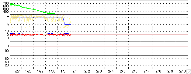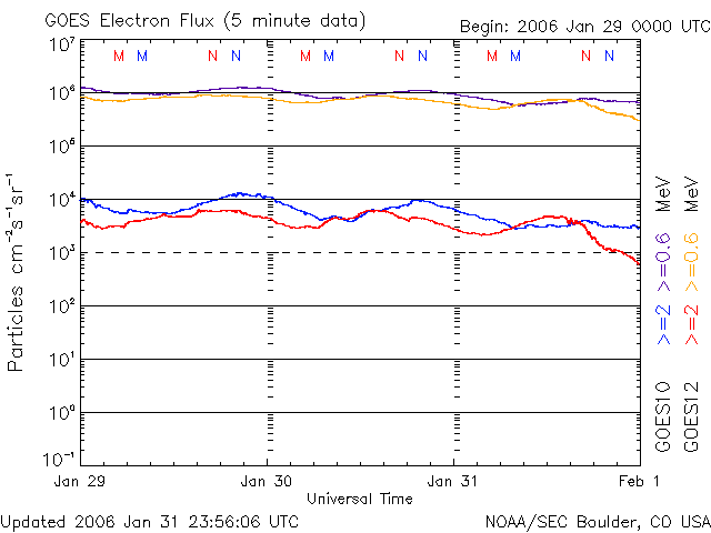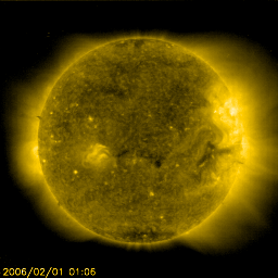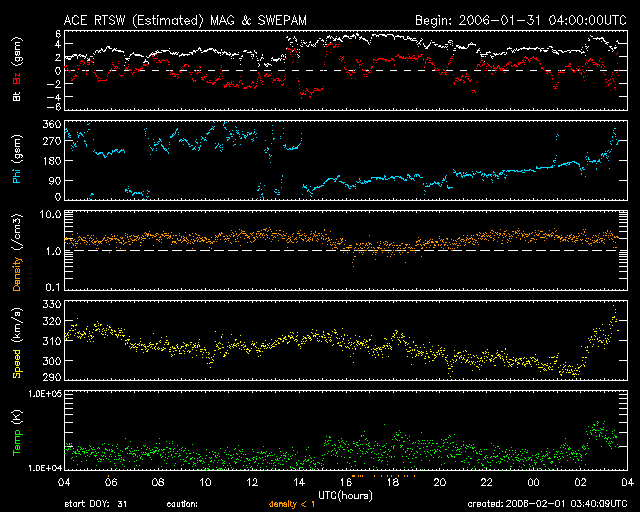 2006/ 2/ 1 12:44 更新 太陽風は速度はとても遅い状態です(310km/秒)。磁気圏は静穏です。 担当 篠原 太陽風は速度が310km/秒前後と、遅い状態で安定しています。 磁場強度は若干戻って、2〜4nTくらいになりました。 このため、南向き磁場も-2nTから、時に-4nTが現れるような変化をするようになりましたが、 速度が遅いので磁気圏活動への寄与はとても小さなものになっています。 シベリア磁場データにはわずかに変化が見られている程度です。 ただし、このような静穏な時は、オーロラの活動領域が高緯度側に移動していることがあります。 普段よりも高緯度の地域で、もう少し大きな変化が観測されている可能性はあります。 SOHO EIT284の太陽写真では、全体がうすぼんやりとした姿になってきました。 ところどころに小さく暗い領域があり、小さなコロナホールになっているのかもしれません。 しかし、どれも規模が小さいため、地球へ影響を及ぼすほどの太陽風の乱れは作っていないでしょう。 太陽風はこのまま穏やかな状態を続けそうです。 放射線帯の高エネルギー電子は、密度を下げています。 比較的順調な減少ペースになっていて、警戒ラインを割り、10の3乗レベルに戻っています。 太陽のフレア活動はとても穏やかです。 太陽面は無黒点。 X線のレベルもかなり下がっています。 SOHO衛星のEIT284カメラの映像 (c) SOHO (ESA & NASA)